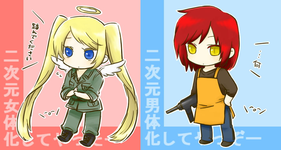 女体化>『服はRPG的な戦闘服で、キツイつり目で金髪のロングのツインテールで天使の輪+羽でドMな感じのキャラ』